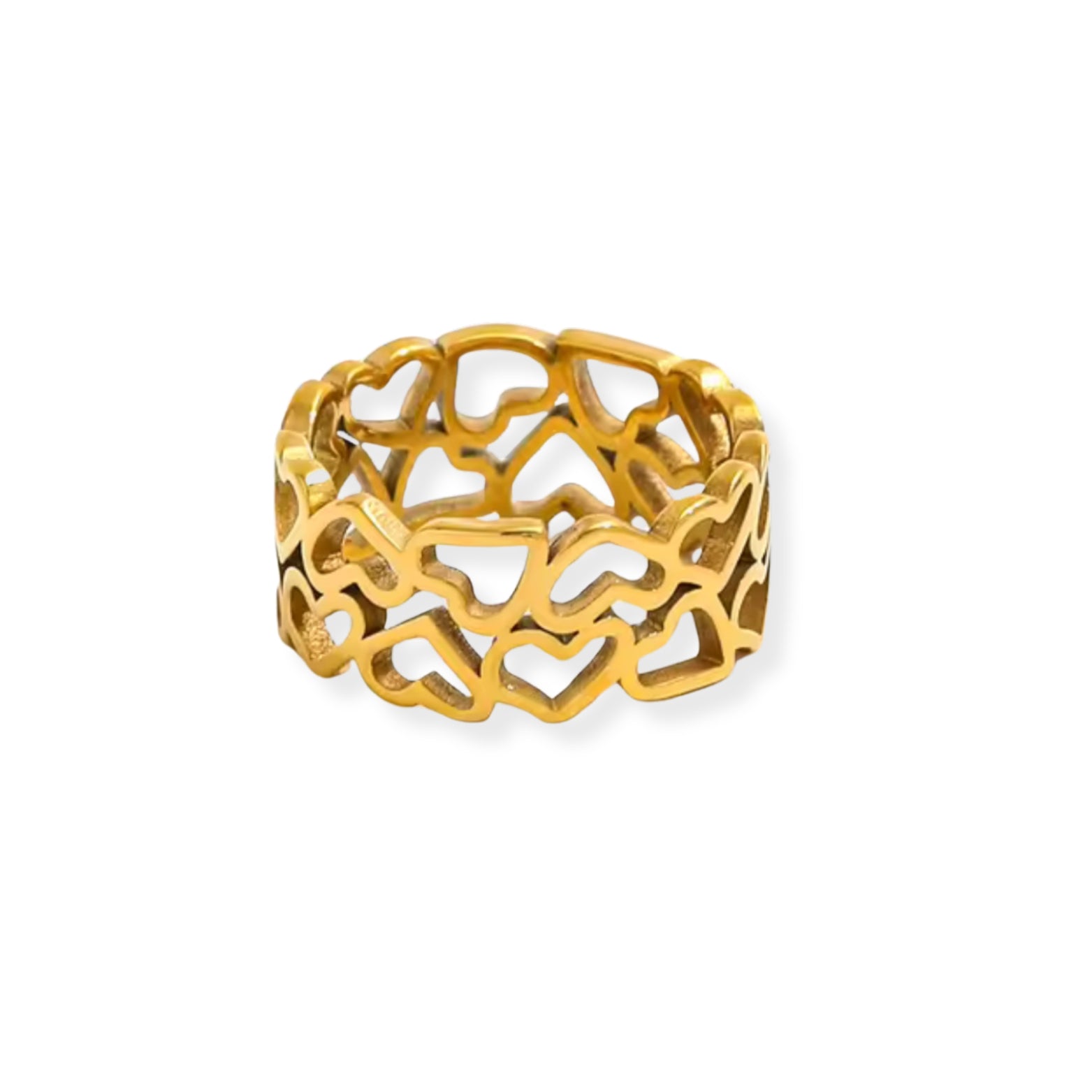 Anillo ancho con diseño calado de corazones entrelazados, estructura ligera y acabado pulido espejo que aporta volumen y estilo contemporáneo.