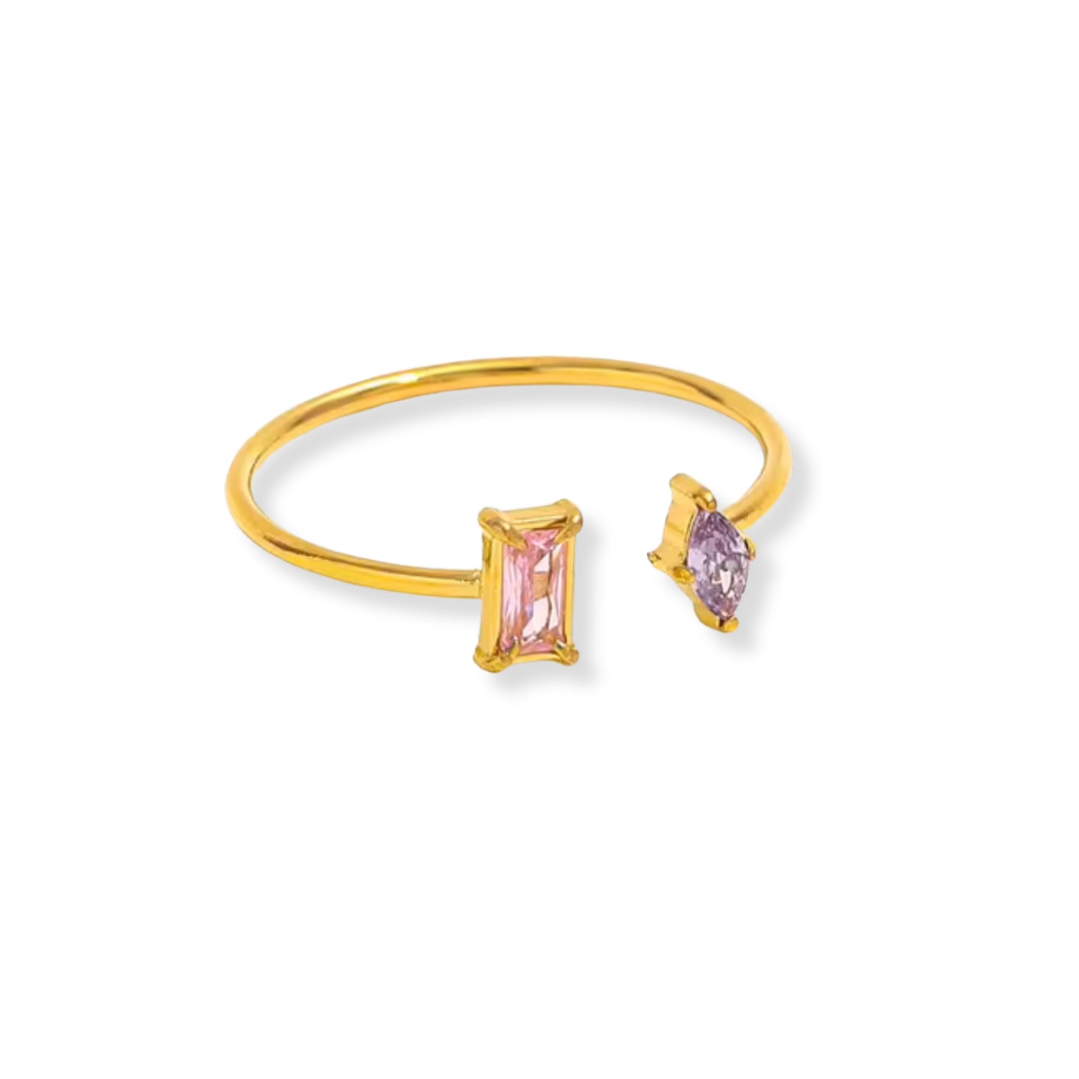 Diseño abierto con doble montura: circonia talla baguette en tono rosa y circonia talla marquise en tono lila.