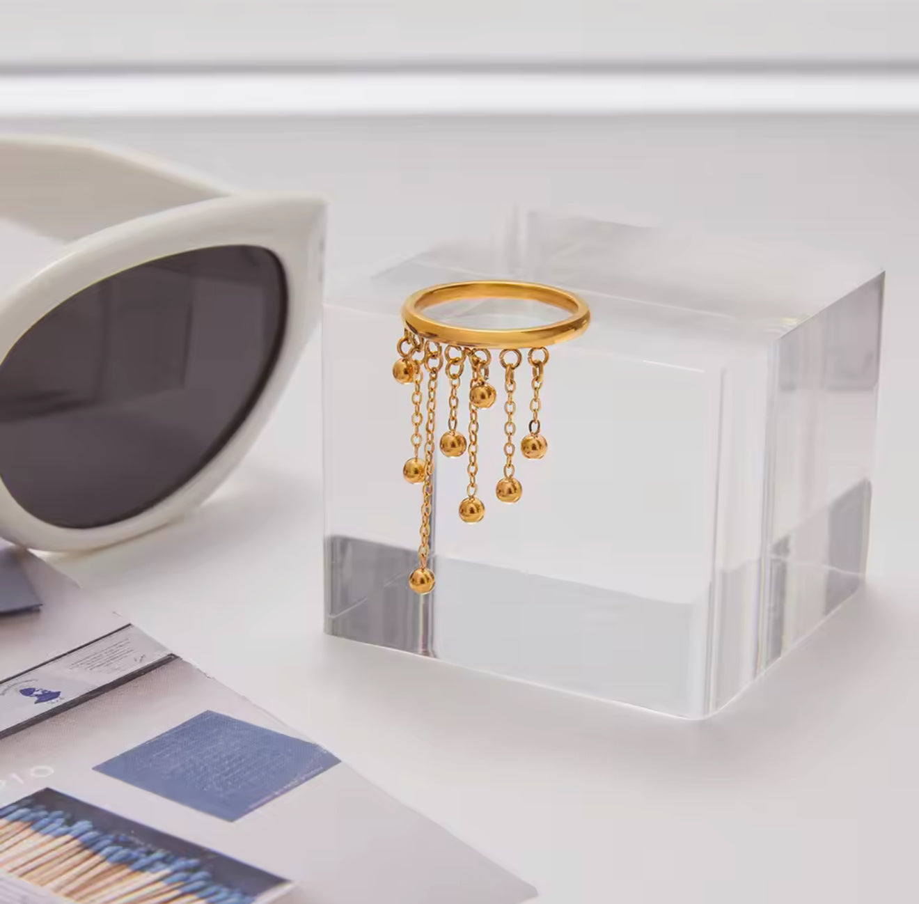 Un diseño vanguardista que combina minimalismo con movimiento. Sus delicadas cadenas con esferas doradas crean un efecto cascada único