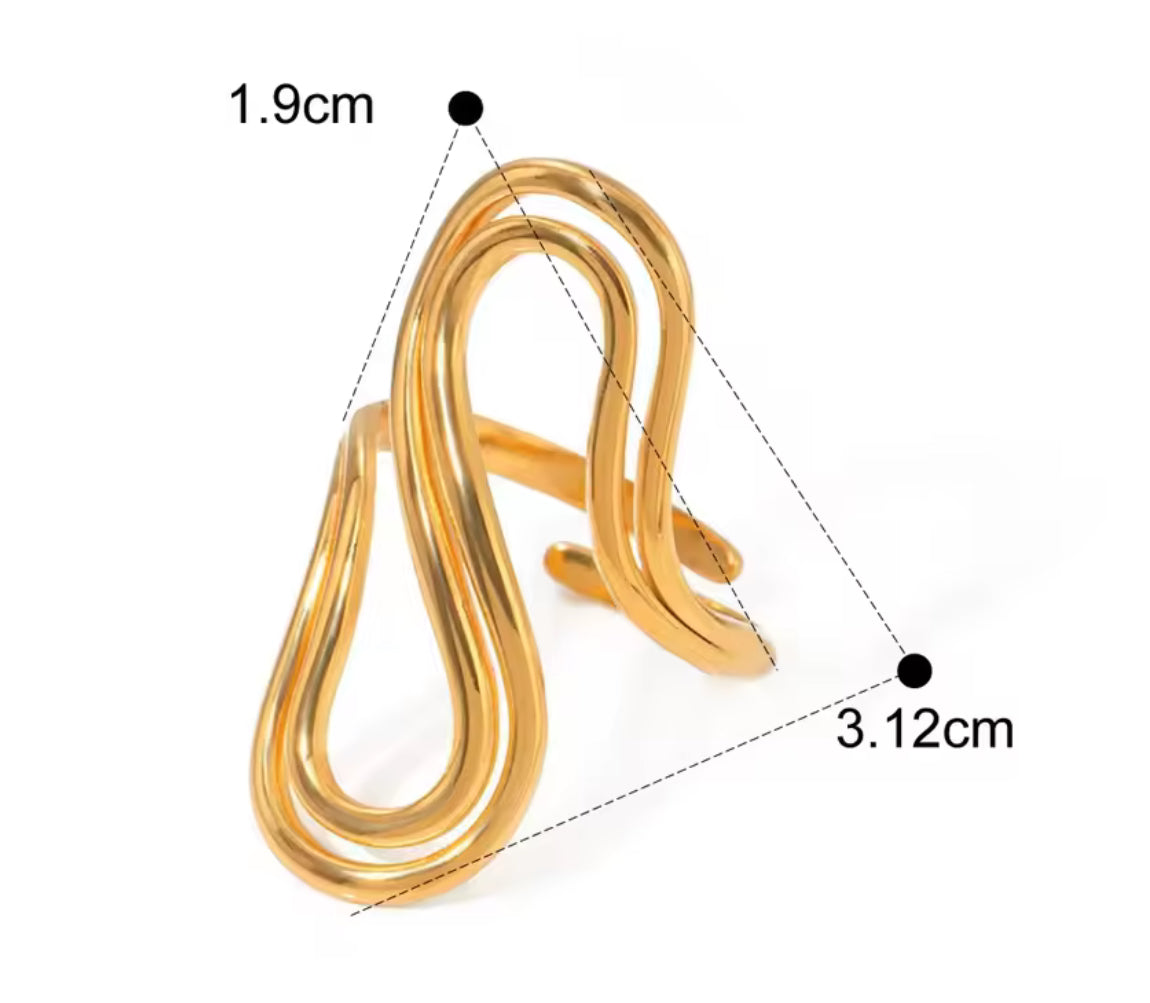 Anillo abierto de silueta fluida con líneas curvas entrelazadas, inspirado en formas abstractas y minimalistas.