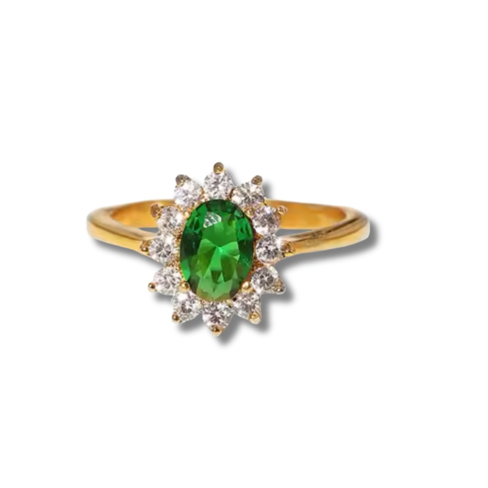 Anillo estilo solitario ovalado con piedra central en verde intenso, rodeada por un halo de circonias brillantes que realzan su luz y crean un diseño majestuoso y sofisticado.