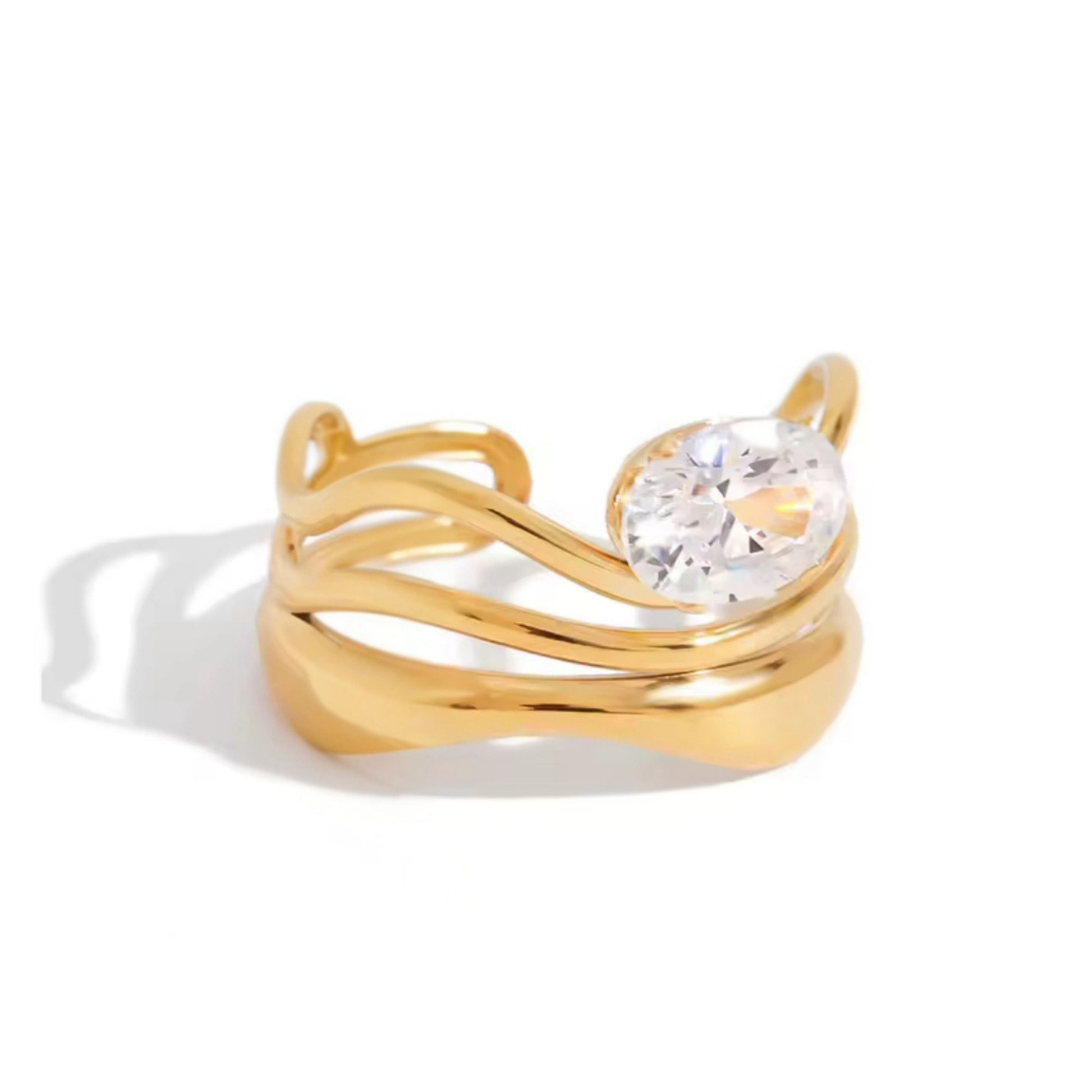 Anillo abierto con diseño de ondas entrelazadas y una circonia central corte oval brillante que resalta con un toque moderno y elegante.