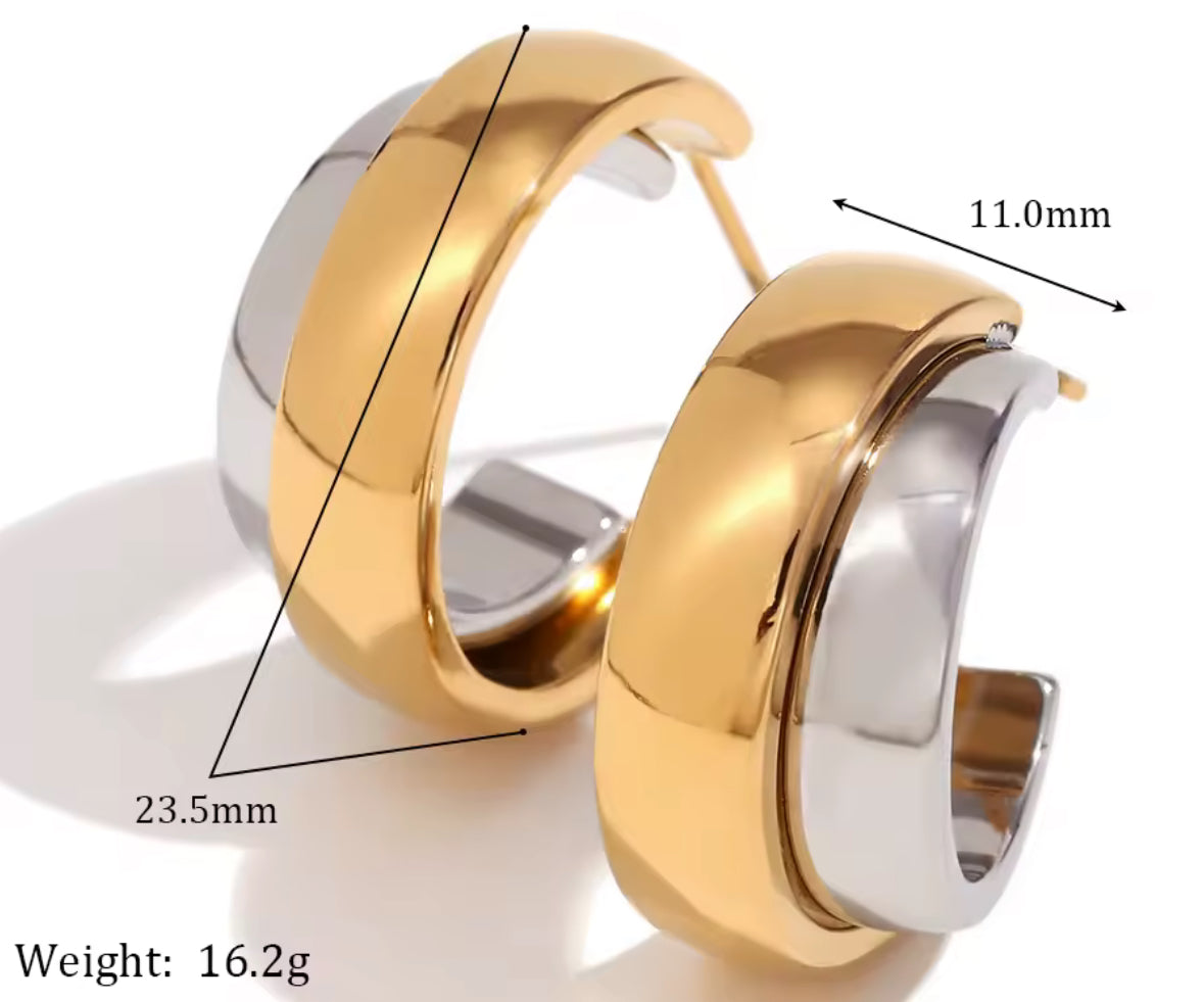 Aretes bicolor con diseño ancho y superficie pulida en dorado y plateado.
