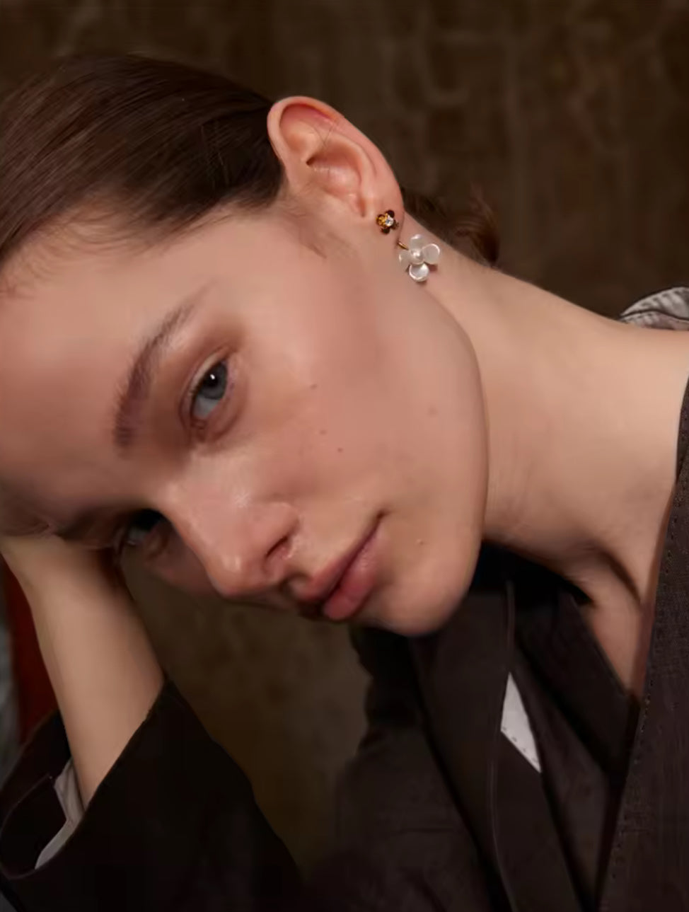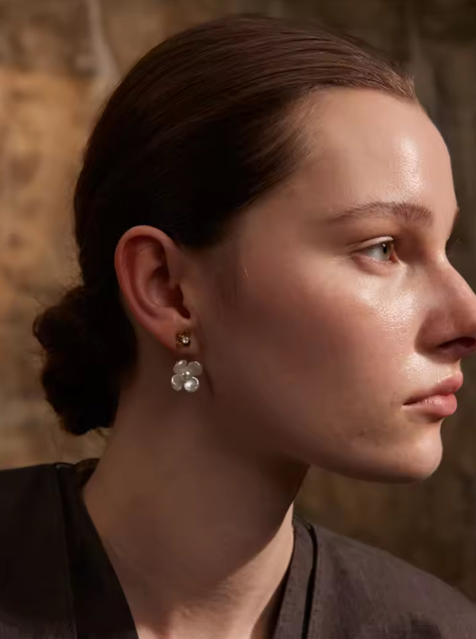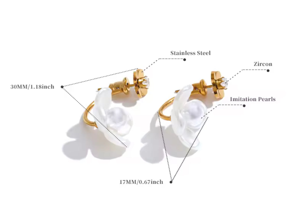 Diseño en forma de flor doble, con pétalos blancos de efecto nacarado y perla central. Aplique frontal con flor dorada y circonita brillante.