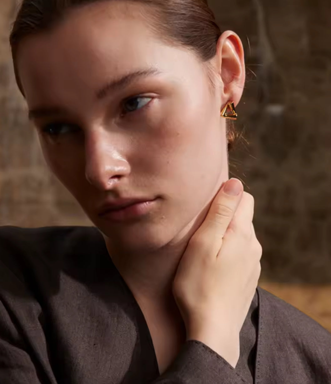 Diseño triangular estructurado a partir de tres conos pulidos, creando un volumen simétrico y llamativo.