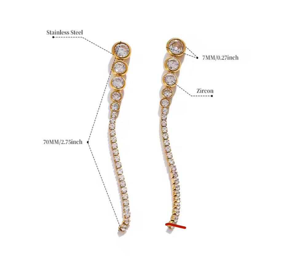 Aretes largos con incrustaciones en degradé de circonitas redondas, que finalizan en una delicada línea de brillo descendente. Diseño estilizado de caída fluida, ideal para eventos nocturnos o looks sofisticados.