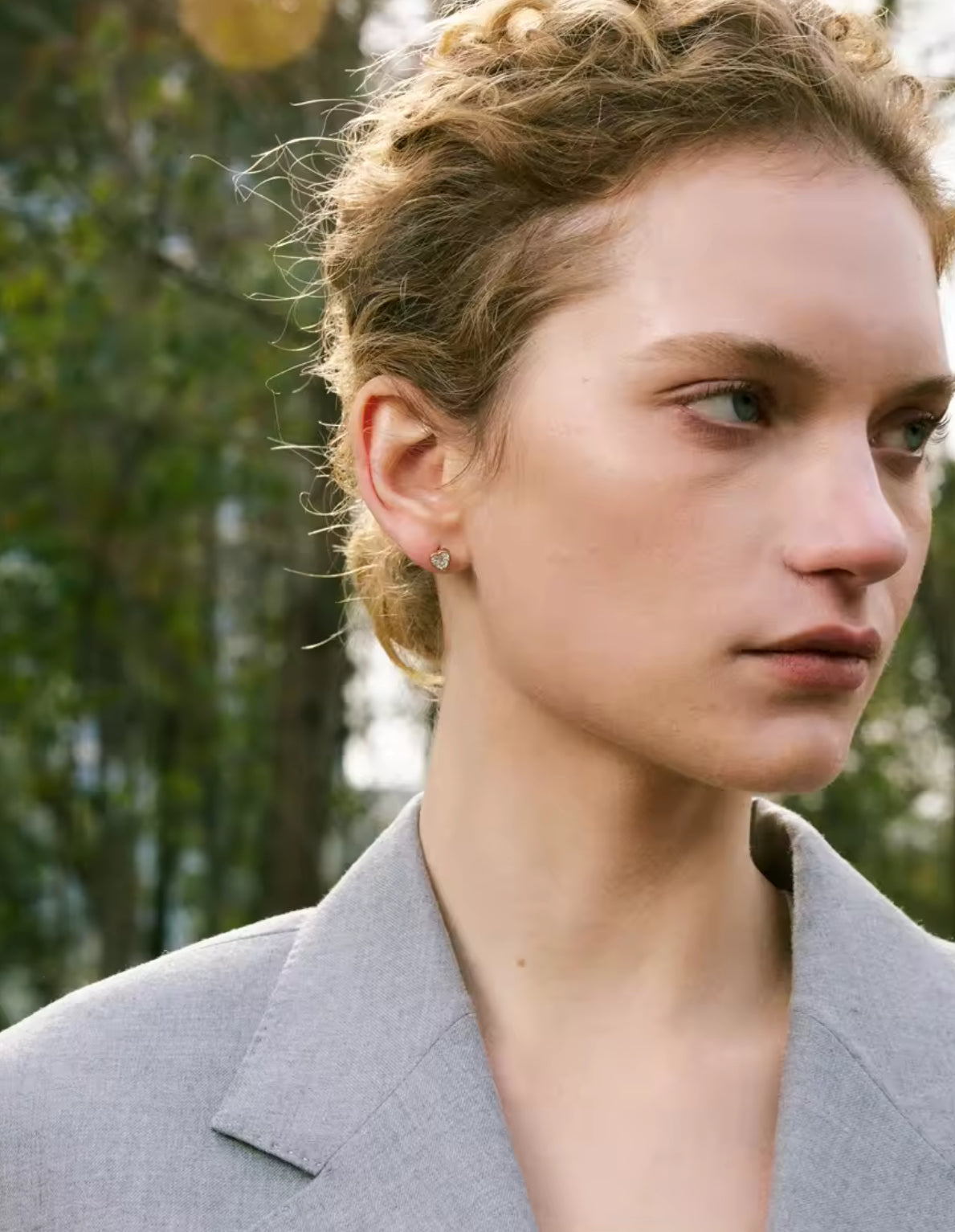 Aretes tipo stud en forma de corazón con circonia facetada en talla brillante. Montados en base de acero inoxidable con baño dorado PVD para máxima durabilidad.