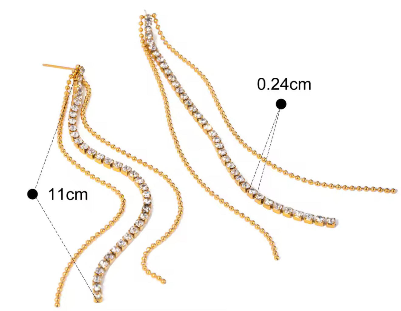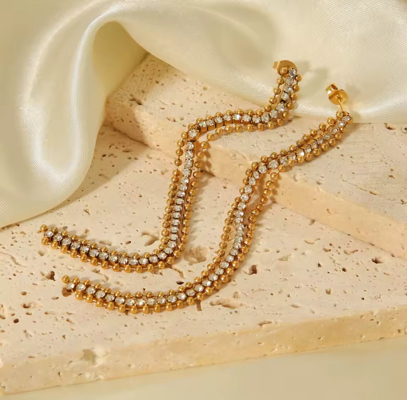 Un diseño de caída fluida con cadenas doradas y Circonias engastados que reflejan la luz en cada movimiento.