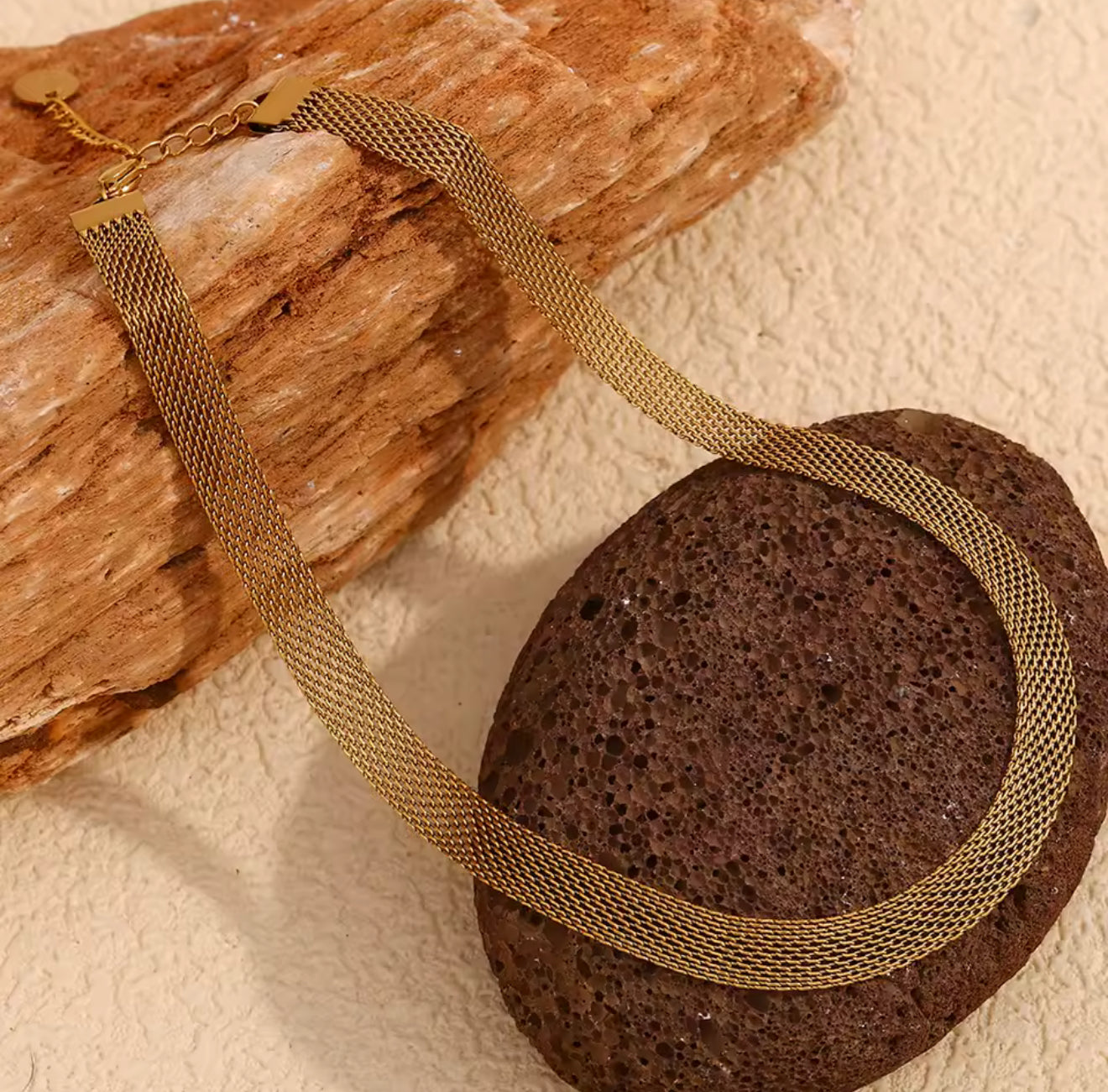 Choker tejido tipo malla con acabado plano y ajustable. Su diseño minimalista y elegante lo convierte en un básico versátil para combinar en capas o lucir solo.
