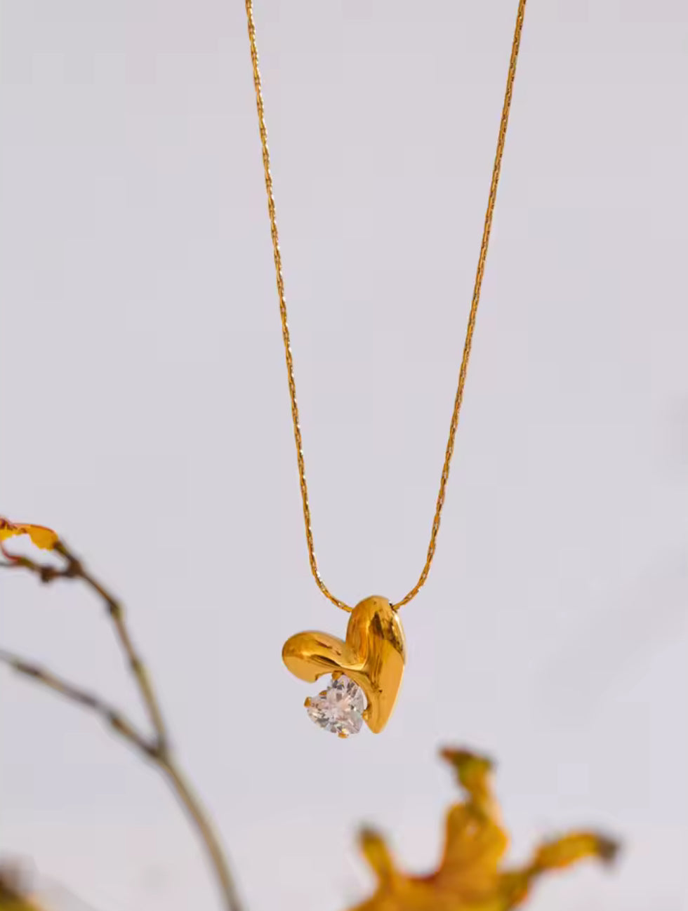 Collar con dije en forma de corazón estilizado, incrustado con circonia talla brillante. Su diseño resalta por el contraste entre la silueta orgánica del corazón y el destello facetado de la piedra central.
