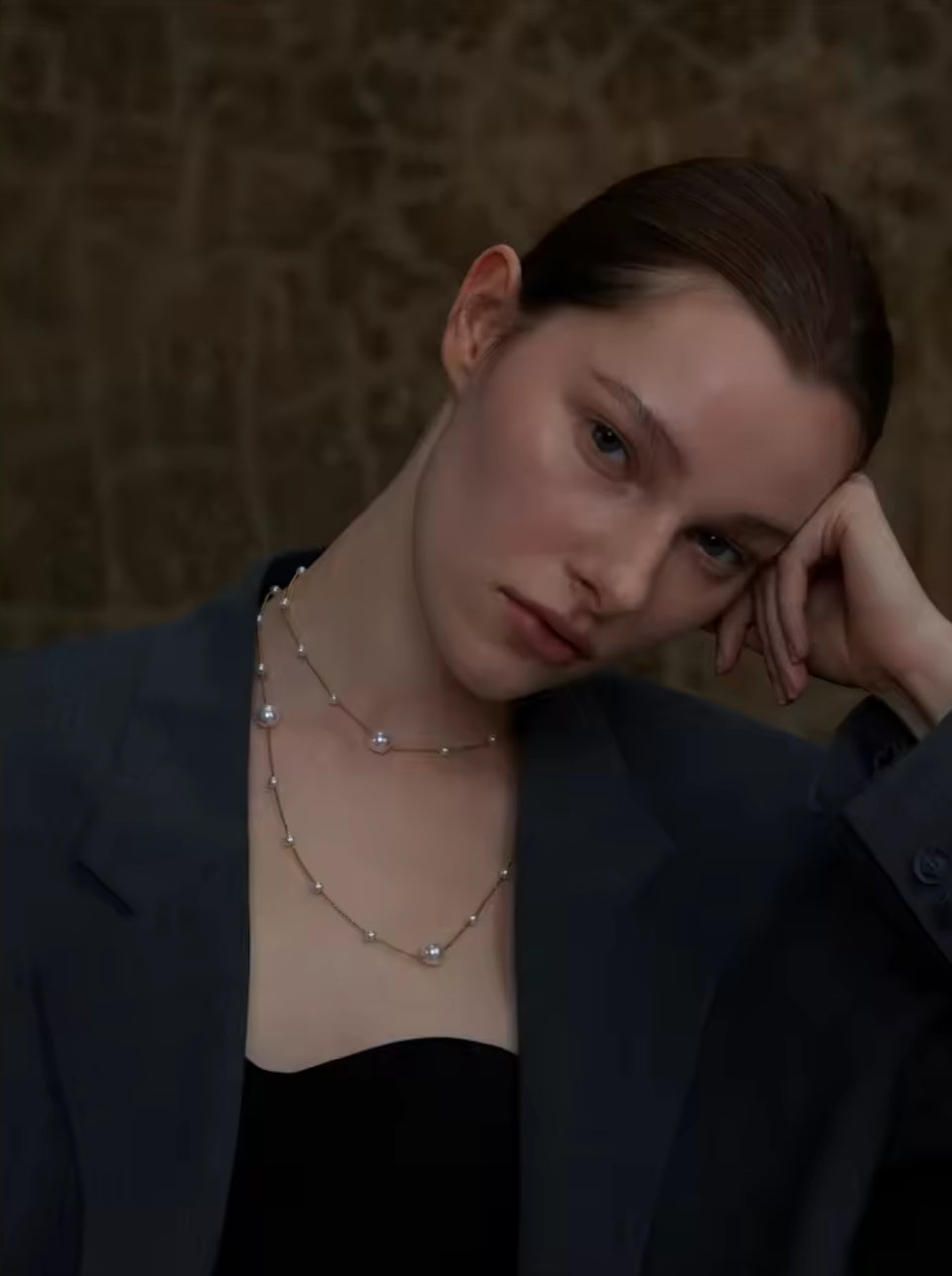 Collar con perlas esféricas en montaje intercalado sobre cadena fina.
