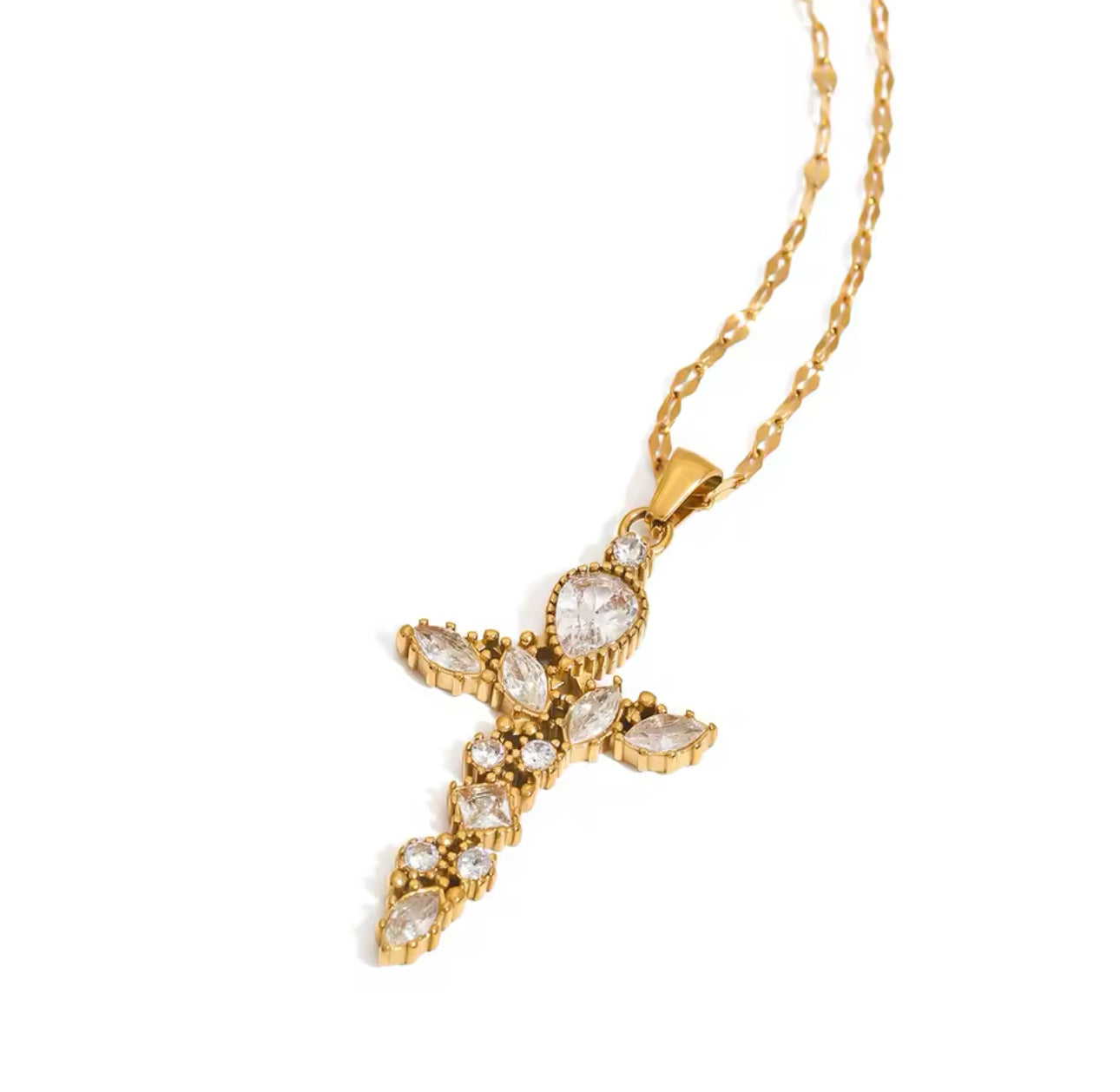 Collar con dije en forma de cruz, incrustado con circonias en corte lágrima y redondo, que aportan brillo elegante y sofisticado.