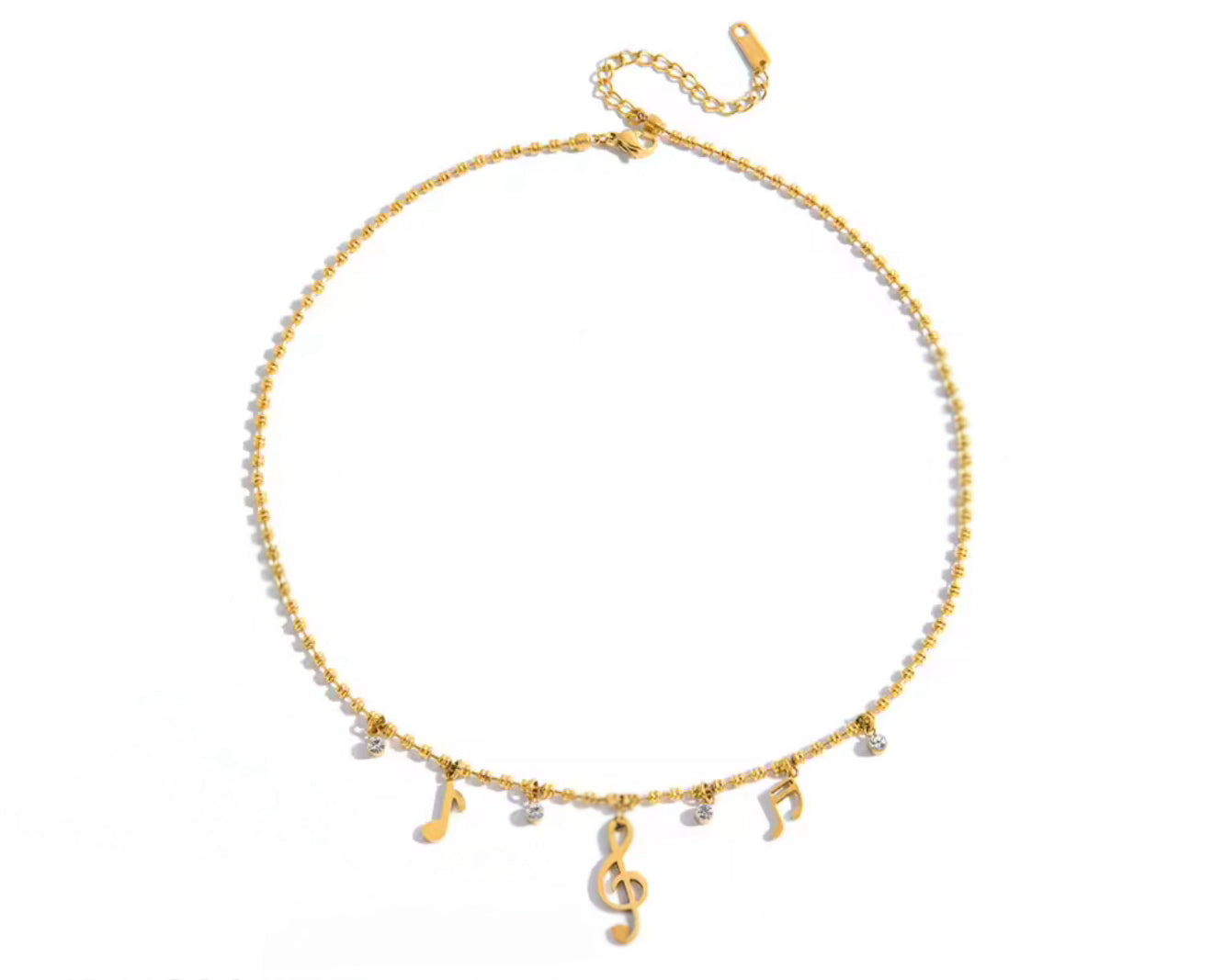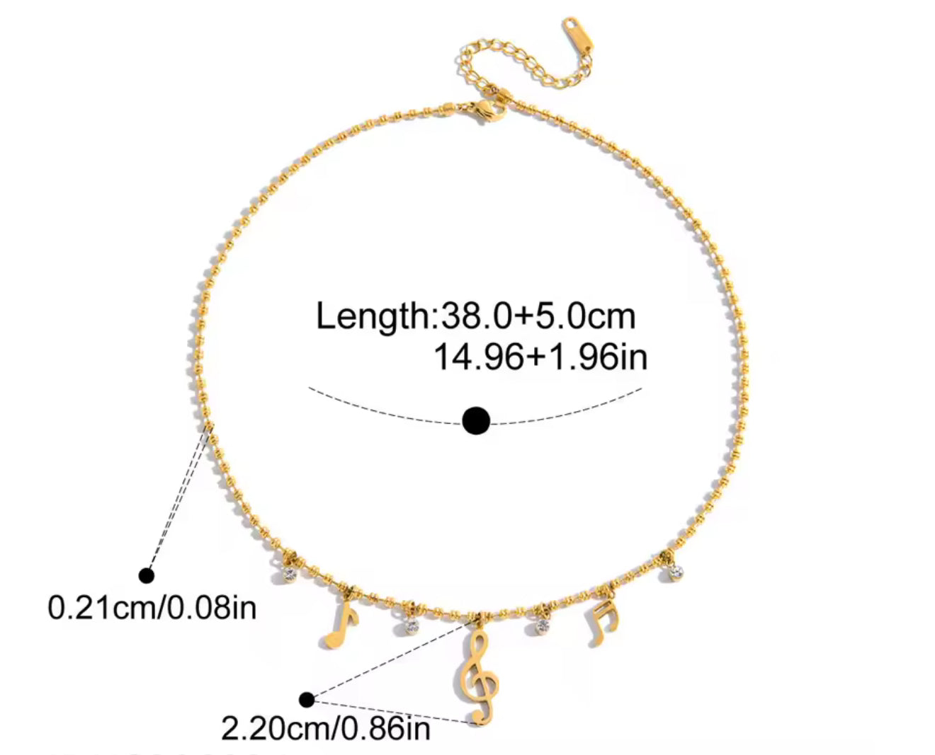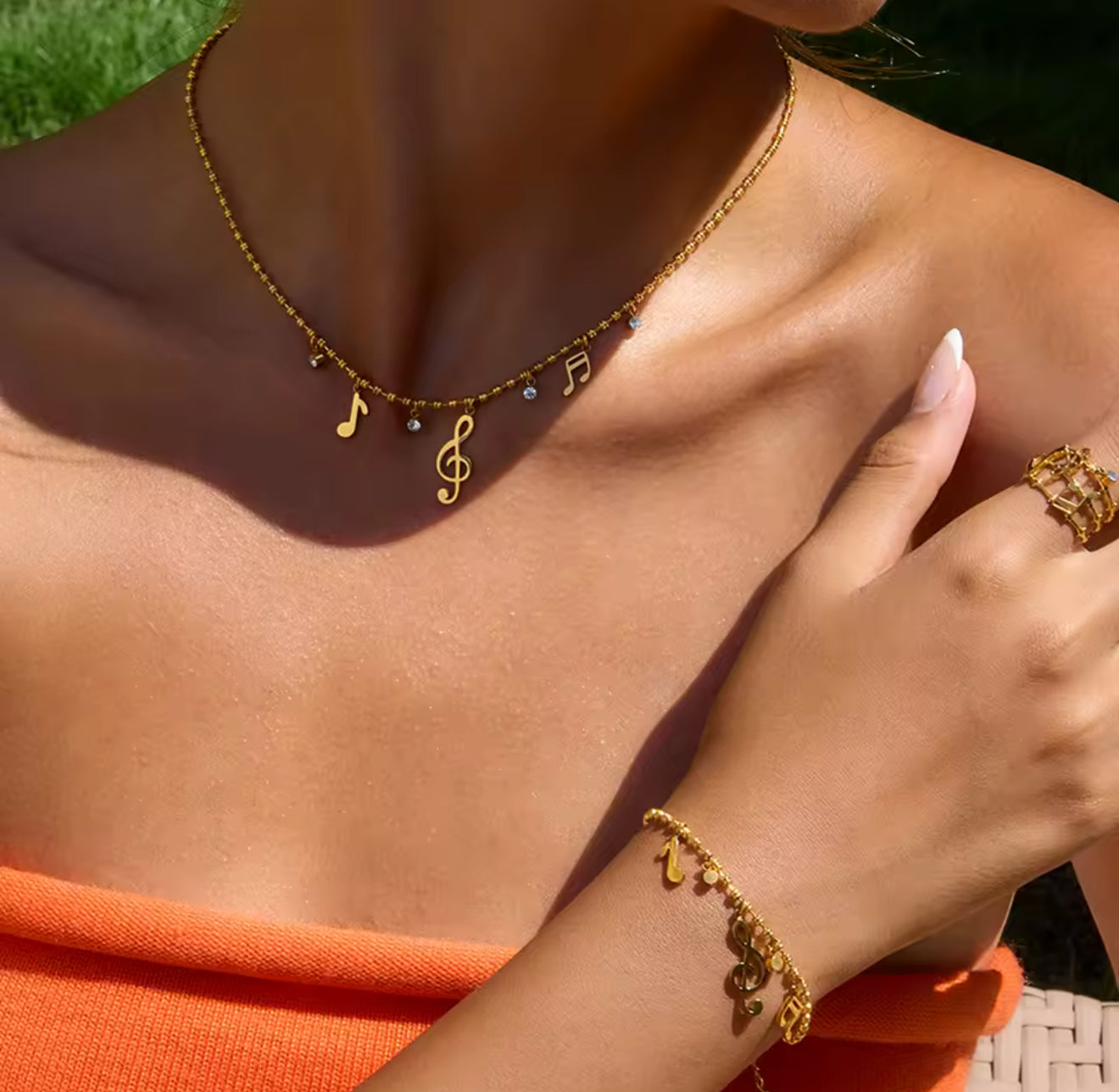 Un diseño encantador inspirado en la música. Su cadena delicada con colgantes en forma de notas musicales y detalles brillantes aporta un estilo juvenil, artístico y sofisticado, perfecto para expresar tu esencia única.