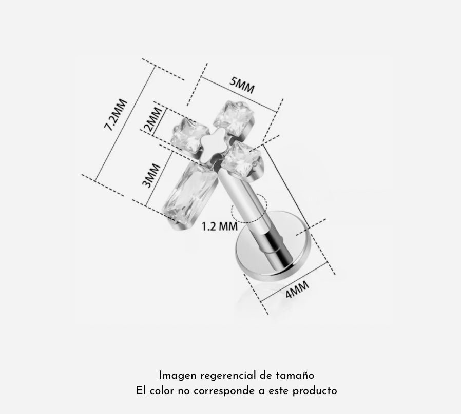 Piercing con diseño de cruz dorada, realzada con circonias rectangulares y cuadradas. Una pieza que combina estilo moderno con un toque espiritual.
