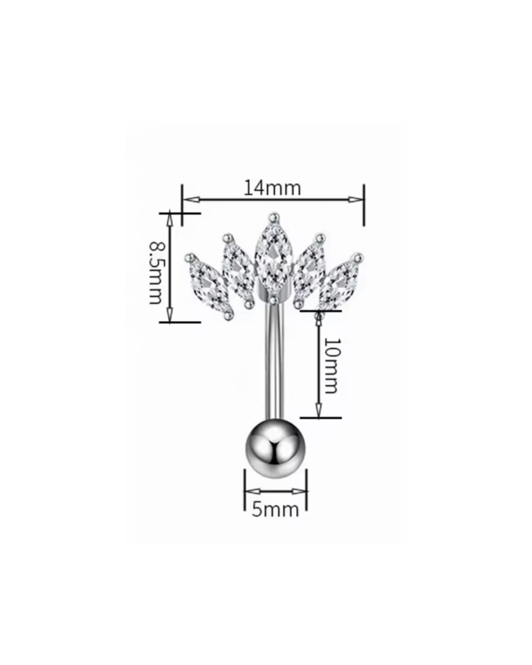 Piercing plateado con diseño en forma de corona abierta, decorado con circonias blancas en corte marquise.