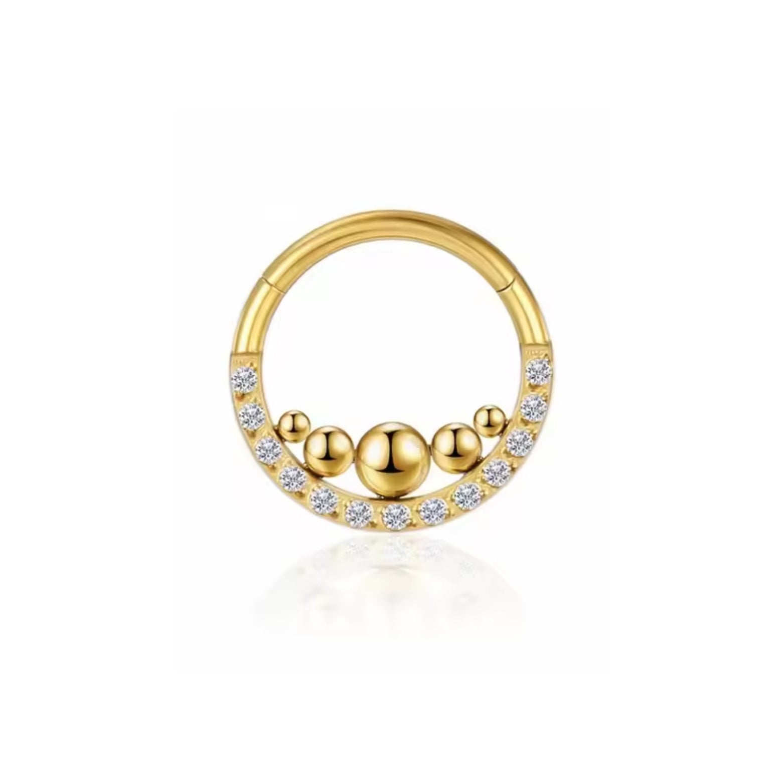 Un diseño sofisticado en acabado dorado, adornado con circonias brillantes y un juego de esferas centrales que lo hacen destacar con un estilo moderno y elegante.