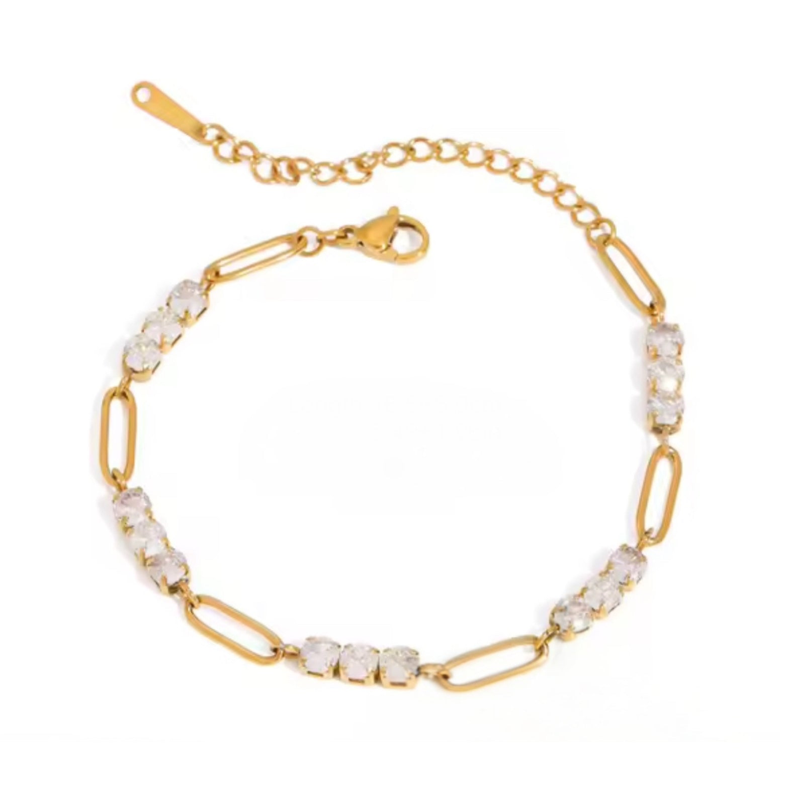 Una sofisticada pulsera de eslabones dorados adornada con destellos brillantes que captura la luz con cada movimiento.