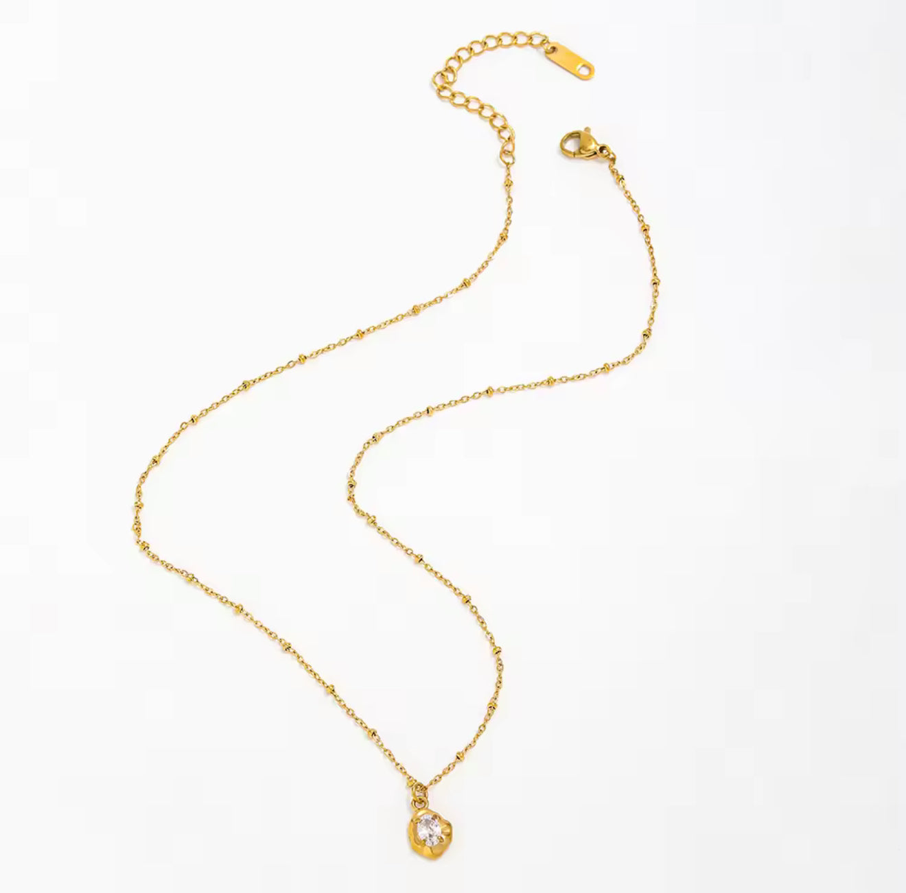Collar delicado, con cadena facetada y dije orgánico engastado con circonia, que captura la luz en cada movimiento para un brillo sutil.